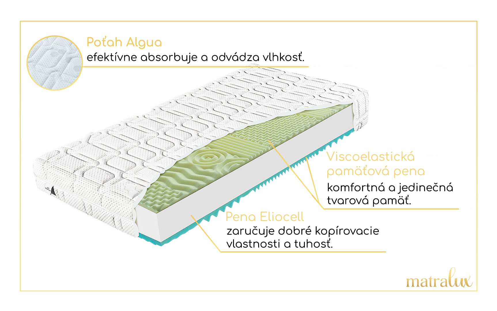 Mimoriadne pohodlný matrac s odvetraným jadrom vyhotovený z BIO peny, ideálny pre osoby s preferenciou mäkšieho lôžka.